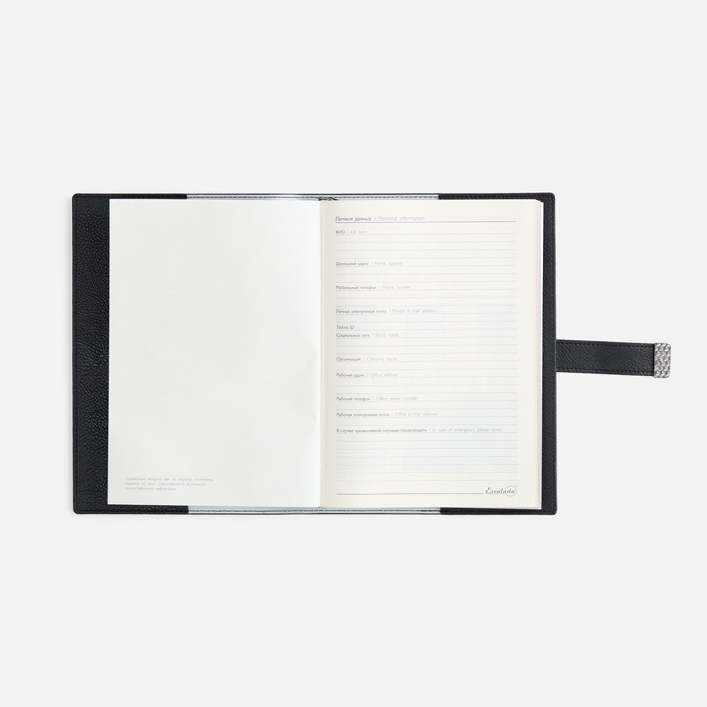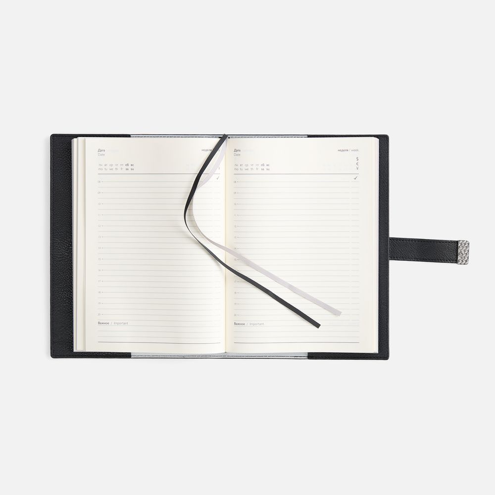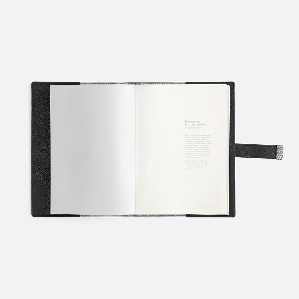 Ежедневник в мягком переплете со съемной обложкой, дополнен застежкой-хлястиком с металлическим шильдом на кнопке, двойным ляссе и капталом.