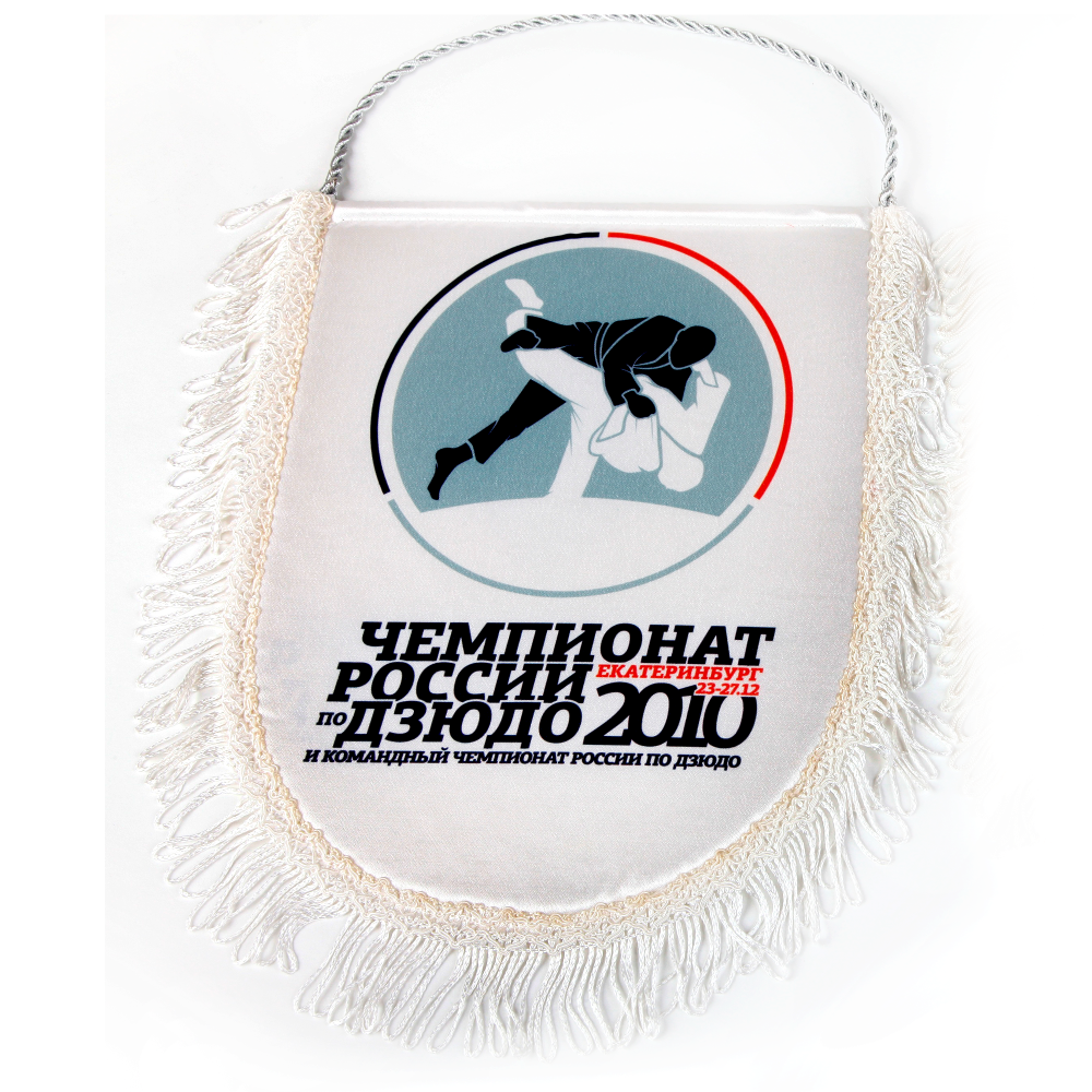 Печатный вымпел изготавливается из крепсатина, имеет основу из картона для придания жесткости, обшивается бахромой. Полноцветное изображение по макету заказчика наносится методом сублимации с одной стороны. При этом оборотная сторона остается белой.