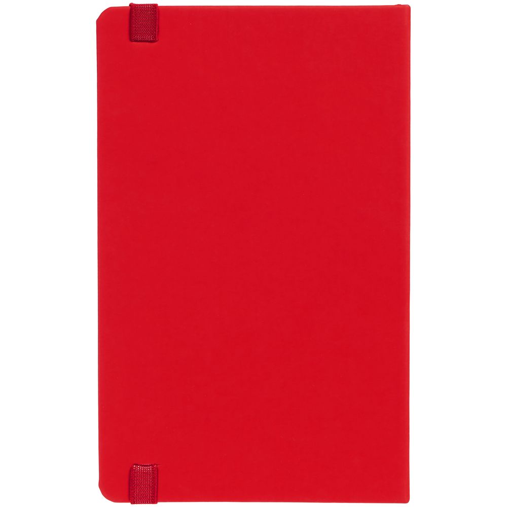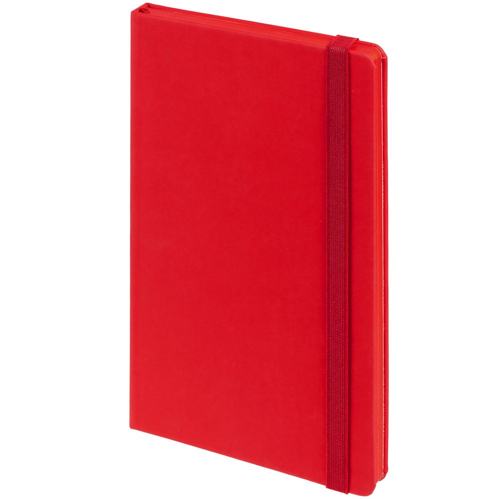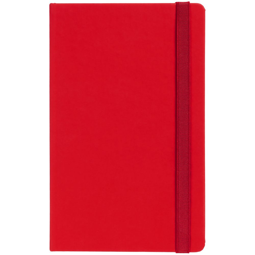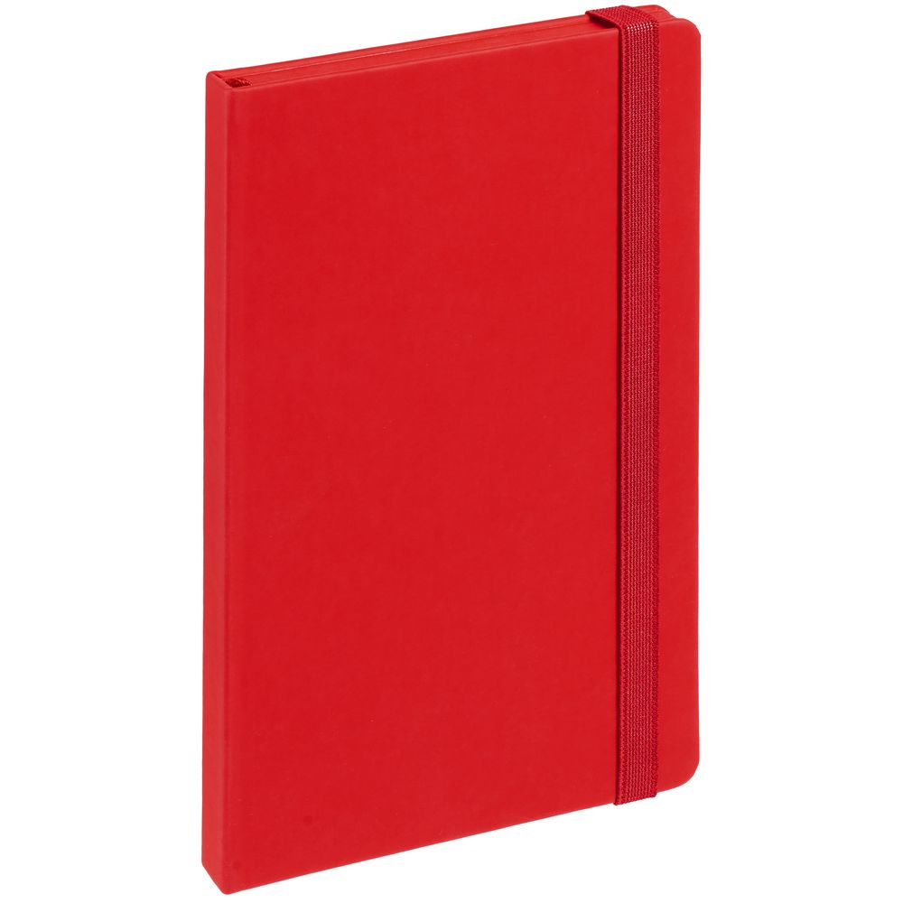Блокнот в твердой обложке, выполнен из материала Soft Touch Ultra, красный РР, дополнен резинкой и ляссе в цвет обложки.