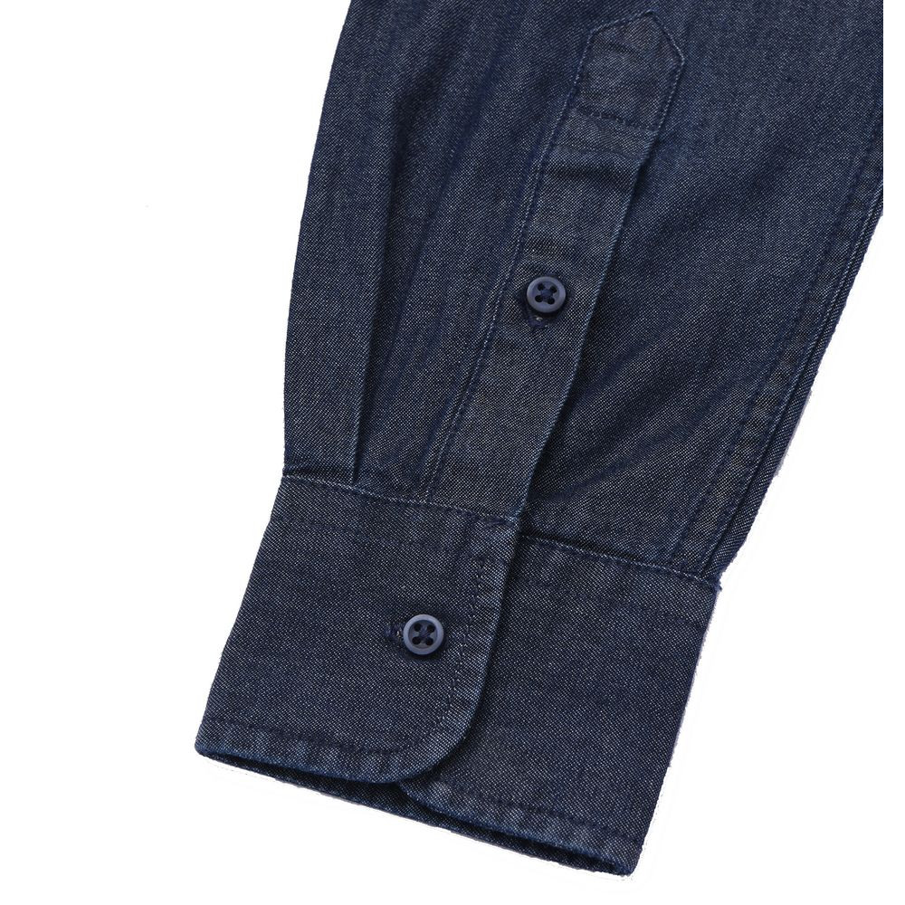Модель классического кроя из денима с воротником на пуговицах, планкой на 7 пуговиц в тон и манжетами на 1 пуговице.