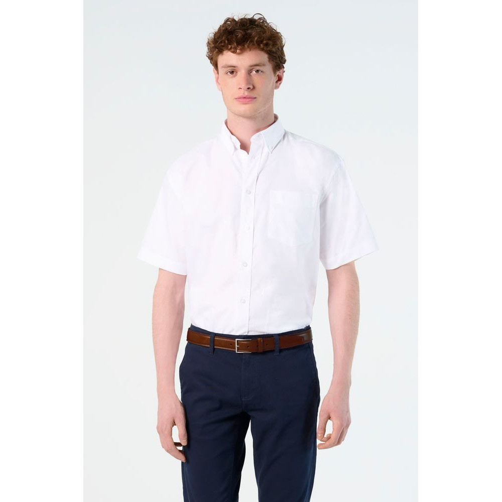 Рубашка из ткани «Оксфорд» с нагрудным карманом слева. На спинке две симметричные складки, воротник на двух пуговицах, регулируемые манжеты, планка с семью пуговицами в тон.