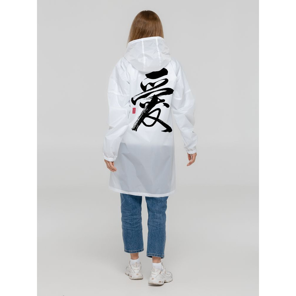 Иероглифы коллекции «Вечные ценности» выполнены в жанре каллиграфии на древнекитайском диалекте мандарин. Плавные линии символизируют внутренний баланс и фокусировку на главных жизненных ориентирах.Плащ-дождевик из ткани таффета на молнии с капюшоном. Складывается в мешочек — удобно брать с собой.