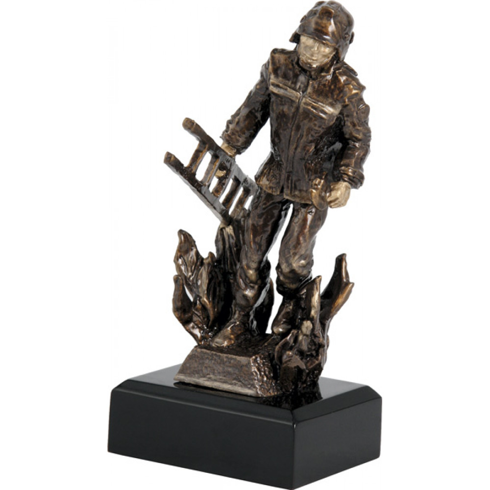 Фигурка литая "Пожарный". Цвет бронза. Материал: пластик. Высота 19 см. Изображен пожарный, идущий сквозь огонь, в руках у него лестница. Изображение пожарного расположено на элементе в форме усеченной пирамиды, которая установлена на цоколе. Цоколь в форме прямоугольника, цвет черный.