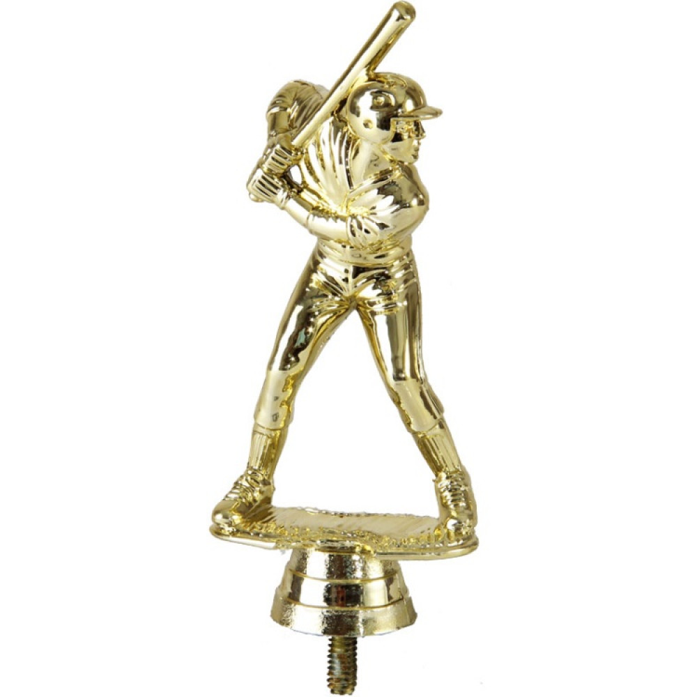 Цвет: золото, материал: пластик. Вид спорта: бейсбол. Фигурка выполнена в виде спортсмена, готовящегося отбить мяч. Он прогнулся в спине, локти широко расставлены по сторонам. В руках зажата бита. Голова мужчины повернута в сторону. Ноги расставлены на ширине плеч, колени немного согнуты для лучшей устойчивости. Спортсмен одет в спортивную форму, не стесняющую движения. Ниже - круглое основание, на котором имеются горизонтальные линии. Высота, см: 12.7 Вес, кг: 0.048. Фигурку возможно закрепить на цоколь, постамент или кубок.