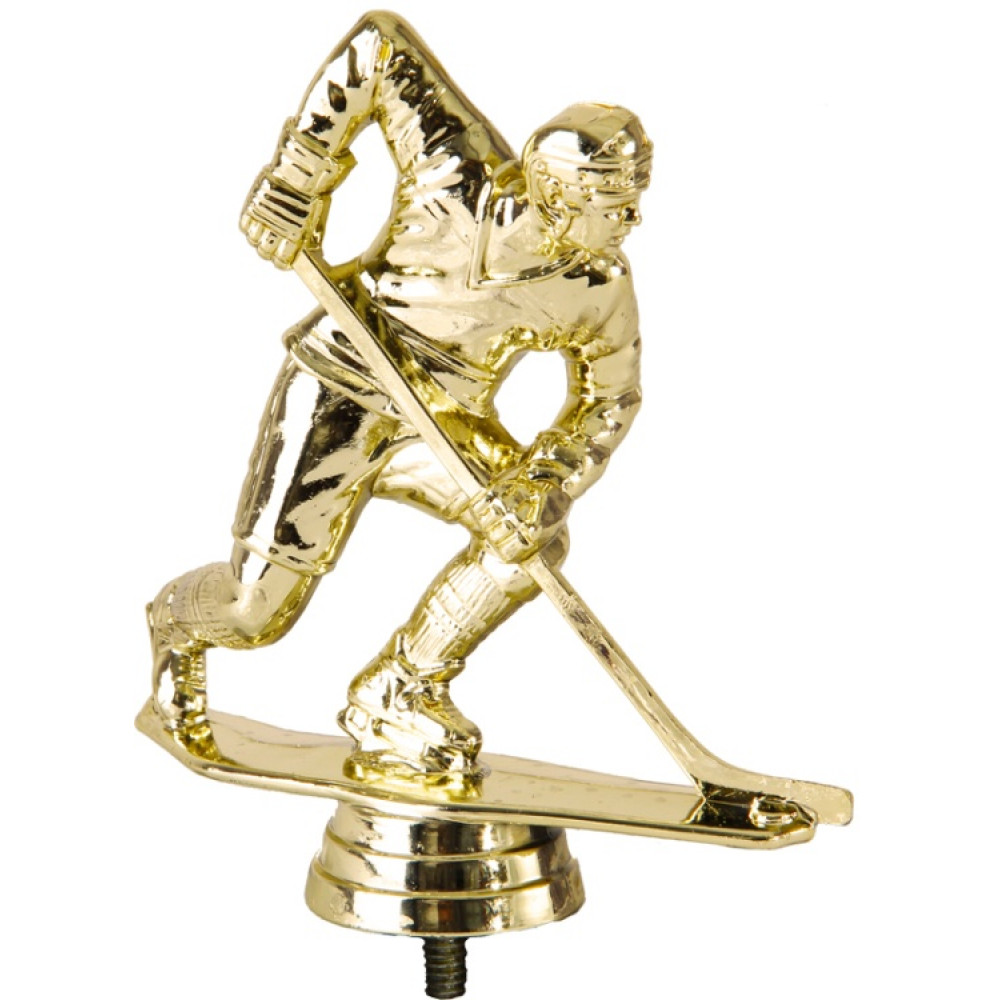 Цвет: золото, материал: пластик. Вид спорта: хоккей. Фигурка выполнена в виде мужчины. Ощущение непрерывного движения создаётся за счёт расположения ног спортсмена: одна нога отставлена назад на лезвие конька, вторая согнута в колене и выдвинута в шаге вперёд. В руках хоккеист держит клюшку, которой он плавно ведёт шайбу. На нём надето спортивное снаряжение, в том числе и шлем. Хоккеист находится на вытянутой прямоугольной пластине – имитации льда. Ниже - круглое основание, на котором имеются горизонтальные линии. Высота, см: 11.4 Вес, кг: 0.061. Фигурку возможно закрепить на цоколь, постамент или кубок.