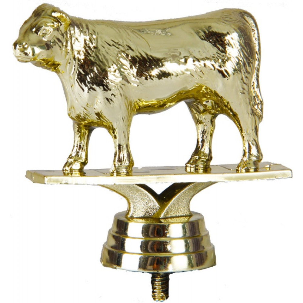 Цвет: золото, материал: пластик. Тема: корова. Фигурка выполнена в виде коровы. Её длинный хвост с пушистой кисточкой опущен вниз. Густая шерсть покрывает всё её тело. На теле фигурки имеются тонкие линии, имитирующие шерсть животного. Короткие уши прижаты к голове. Ноздри широко раздуты. Корова находится на тонкой прямоугольной пластине – имитации земли. Ниже - круглое основание, на котором имеются горизонтальные линии. Высота, см: 8.6. Фигурку возможно закрепить на цоколь, постамент или кубок.