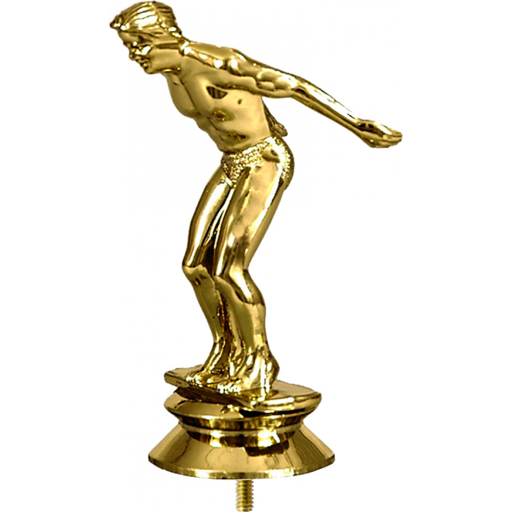 Фигурка пластиковая "Плавание". Цвет золото. Высота 9 см. Изображен пловец, который готовится совершить прыжок в воду: ноги слегка согнуты в коленях, руки держит прямо, отведены назад, корпус тела немного наклонен вперед. Спортсмен одет в купальные плавки. ¶Фигурка установлена на плоской прямоугольной подставке, под подставкой находится стем в виде небольшого элемента конусообразной формы. ¶Фигурку возможно закрепить на цоколь, постамент или кубок.