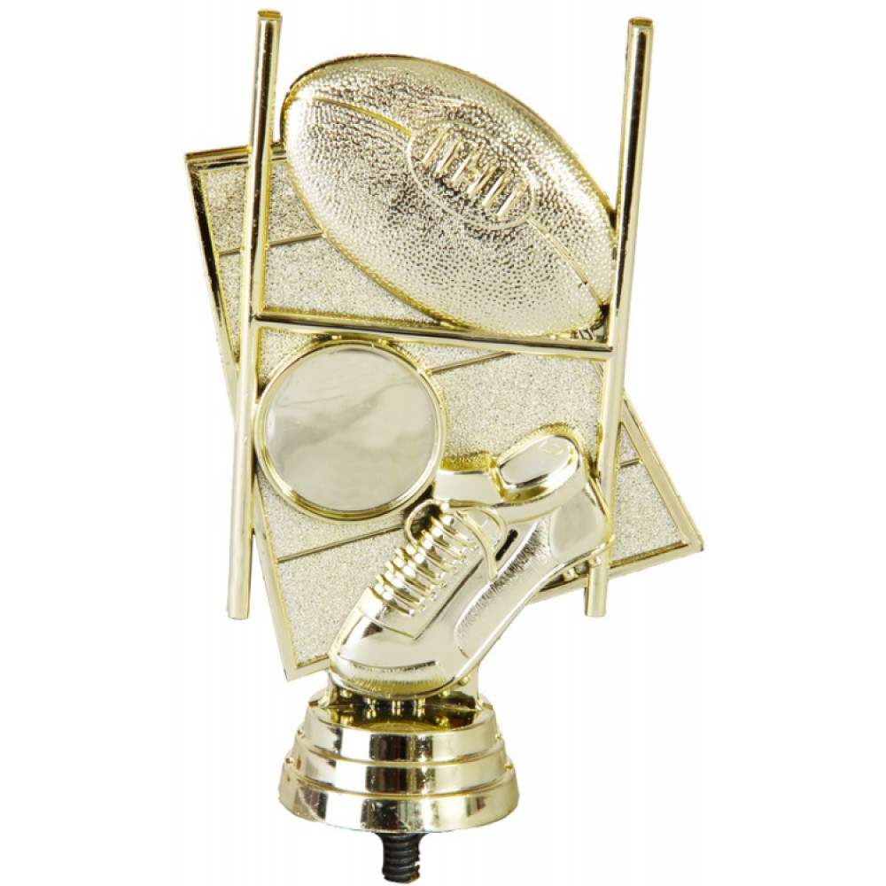 Цвет: золото, материал: пластик. Вид спорта: регби. Фигурка выполнена в виде прямоугольника, который является миниатюрной версией поля для игры в регби. Визуально поле разделено на две половины за счет объёмного декоративного элемента в виде двух вертикальных полос и одной горизонтальной. В верхней половине выполнен мяч для игры в регби: мяч овальной формы. В нижней части выполнено место для нанесения персонализации, обрамлённое обручем, рядом – кроссовок. Фигурка выполнена в золотом цвете, что придаёт ей роскоши и уникальности. Ниже - круглое основание, на котором имеются горизонтальные линии. Высота, см: 12.4 Вес, кг: 0.048. Фигурку возможно закрепить на цоколь, постамент или кубок.