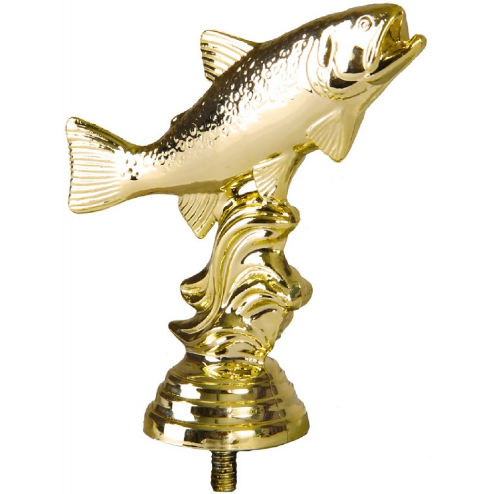 Цвет: золото, материал: пластик. Вид спорта: рыболовство. Фигурка выполнена в виде рыбы, застывшей на волне. Ртом она хватает воздух, плавники неподвижны. Хвостовой плавник немного согнут и приподнят, словно рыба пытается прыгнуть. Золотая чешуя переливается на свету. Рыба лежит брюхом на волне, которая покрыта объёмными волнистыми полосами. Ниже - круглое основание, на котором имеются горизонтальные линии. Высота, см: 10.2. Фигурку возможно закрепить на цоколь, постамент или кубок.