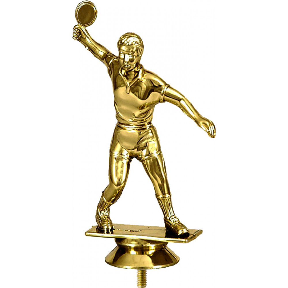 Фигурка пластиковая "Настольный теннис". Цвет золото. Высота 12 см. Изображен спортсмен, играющий в настольный теннис. Спортсмен замахнулся ракеткой для подачи, ракетку держит в правой руке, левая рука выставлена вперед. Спортсмен одет в шорты и поло с коротким рукавом, на ногах высокие носки и кроссовки.¶Фигурка установлена на стеме в виде небольшого элемента конусообразной формы. Фигурку возможно закрепить на цоколь, постамент или кубок.