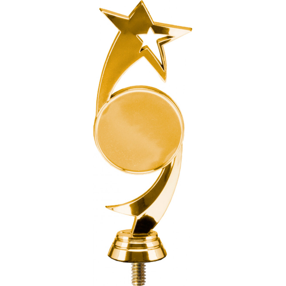 Фигурка пластиковая "Звезды". Цвет золото. Высота 16 см. По центру фигуры расположен эмблемоноситель круглой формы, диаметр 50 мм, имеет тонкий кант. С левой стороны от эмблемоносителя вверх отходит звезда, внутри нее вырезана звезда более меньшего размера. С правой стороны вниз от эмблемоносителя отходит лента. ¶Фигурка установлена на стеме в виде небольшого элемента конусообразной формы. Фигурку возможно закрепить на цоколь, постамент или кубок.