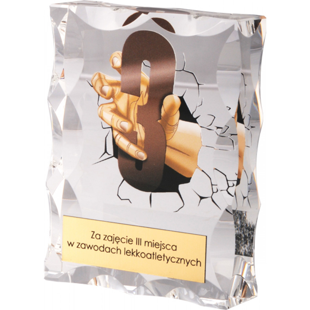 Награда стеклянная "3 место". Прозрачная. Толщина стекла 30 мм. Представляет собой вертикально расположенный прямоугольник, по краю фигуры нанесены срезы в виде полукругов. На вертикальных сторонах по 3 среза, на горизонтальных- по 2.¶На задней части награды нанесено изображение кисти руки, которая держит цифру "3", от изображения в разные стороны отходят нарисованные трещины, будто рука с цифрой "разбила" стекло. В нижней части фигуры возможно нанесение персонализации на металлическом шильде, либо шильде из металлизированной пленки.
