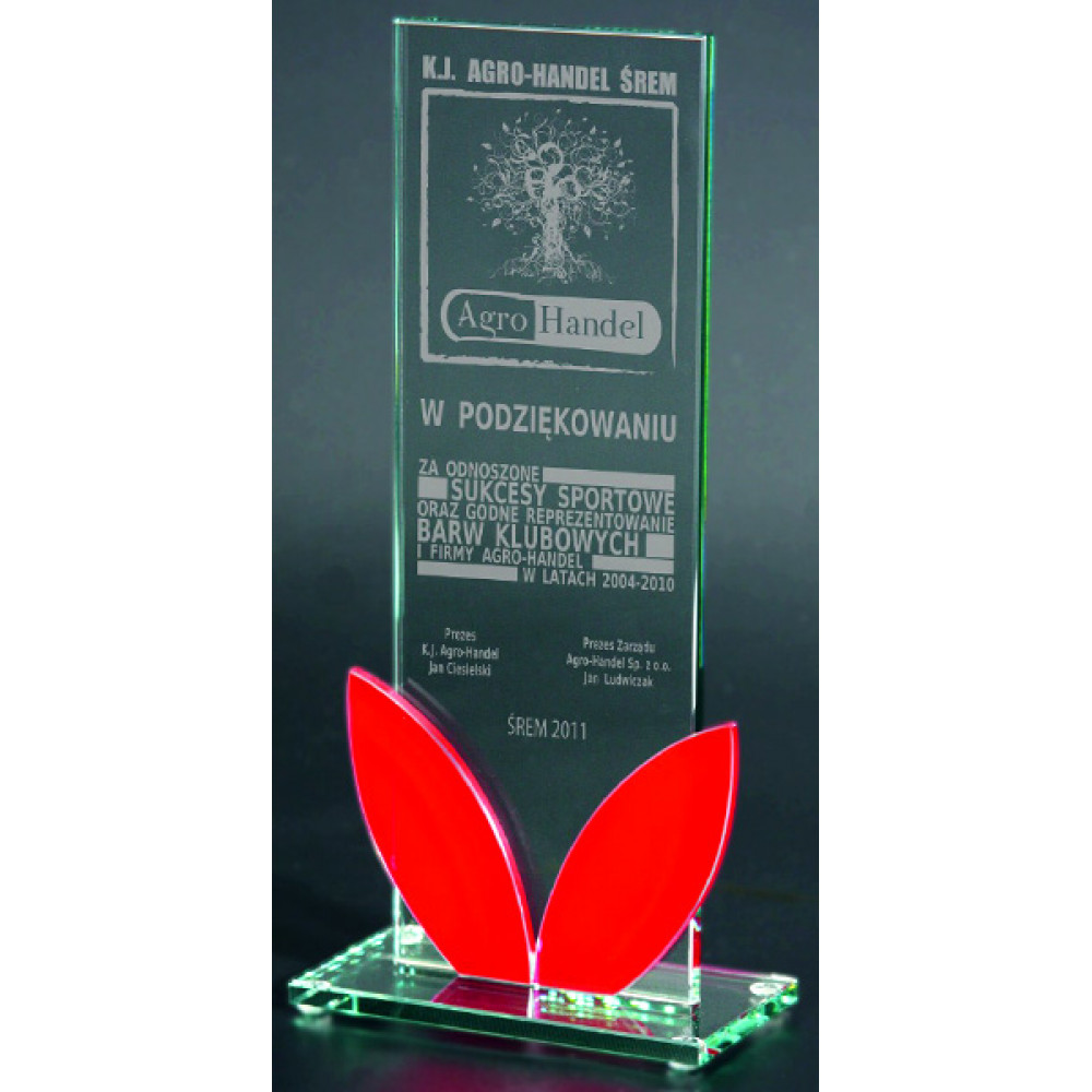 Награда стеклянная. Прозрачная. Толщина стекла 6 мм. Представляет собой вертикальный узкий прямоугольник, установленный на прямоугольную плоскую подставку. В нижней части прямоугольника расположены накладки в виде двух красных листков.