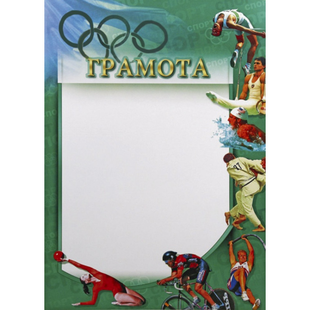 Грамота, формат А4. Бумага матовая, толщина 200 гр, полноцветная печать. ¶Грамота изумрудного цвета с белым фоном по центру. По правому и нижнему краям изображены спортсмены, сверху вниз: прыгун в высоту, гимнаст на кольцах, пловец, борцы, прыгун с шестом, велосипедист, гимнастка с мячом. В верхней части белого фона изображено слово "Грамота" золотым цветом с зеленой обводкой. В левом верхнем углу изображен прозрачный голубой фон с олимпийскими кольцами. Изумрудный фон дополнен полупрозрачными надписями "спорт" и олимпийскими кольцами.