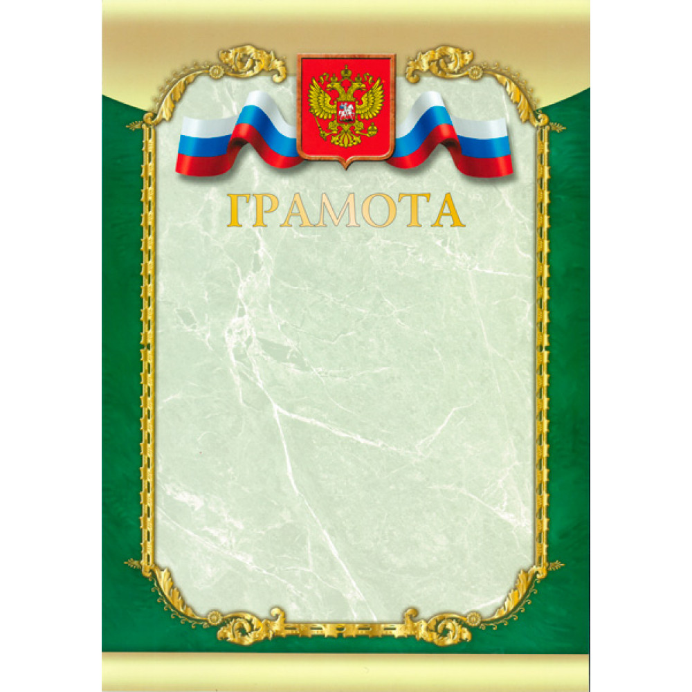 Грамота с тиснением, формат А4. Бумага матовая, толщина 200 гр, полноцветная печать. ¶Фон диплома цветом натурального изумрудного камня. В центральной части диплома прозрачный фон. В верхней части прозрачного фона изображено слово "грамота" с золотым тиснением. Над словом размещен герб России, от которого в левую и правую сторону отходят развивающиеся ленты триколор. Фон для нанесения персонализации имеет ажурную окантовку со сглаженными углами.