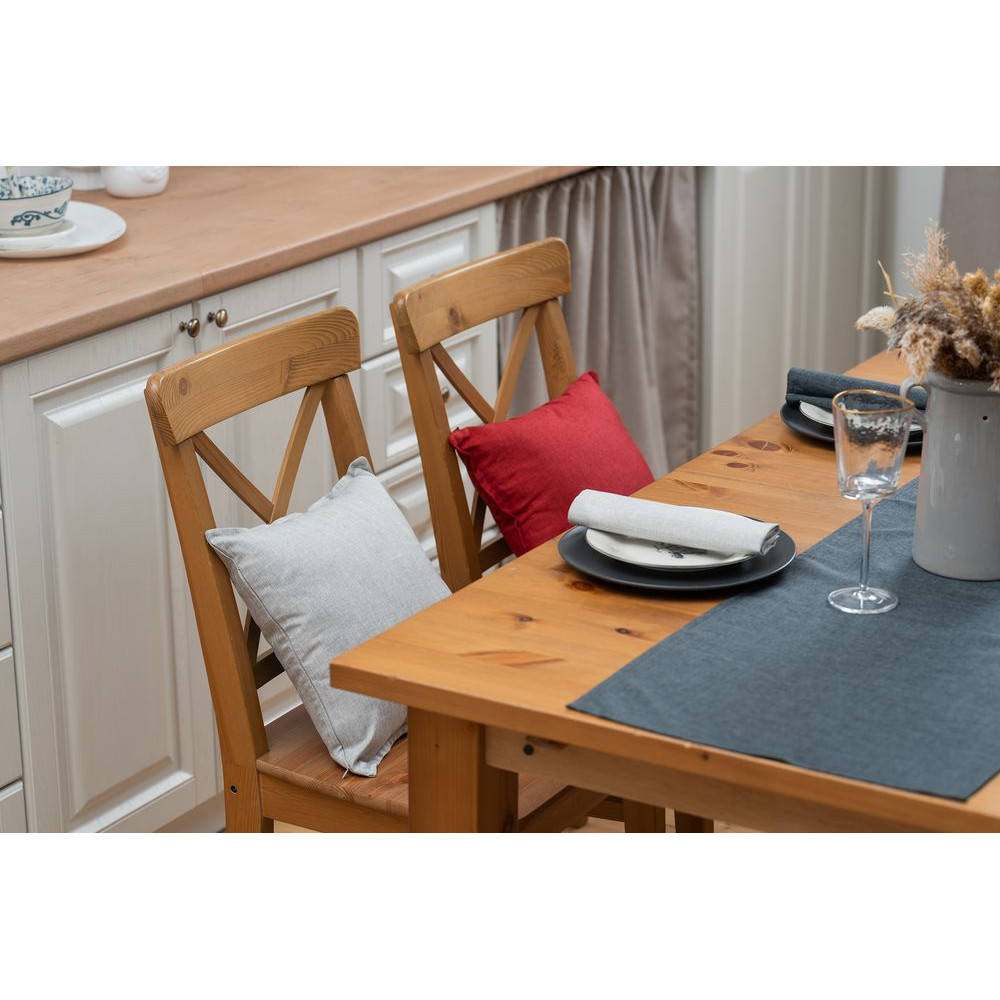 Износостойкая ткань, имитирующая лен, обработана пропиткой от грязи и воды, что делает ее применение для кухни и дома практичным, а уход — легким.