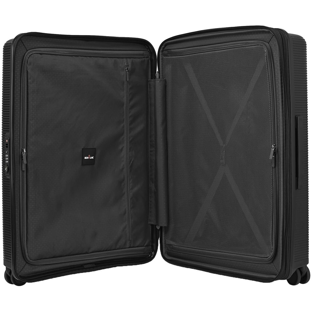 • Чемодан с 2 отделениями: одно из них с фиксирующими ремнями и сетчатым разделителем, второе — с разделителем и карманом-органайзер на молнии