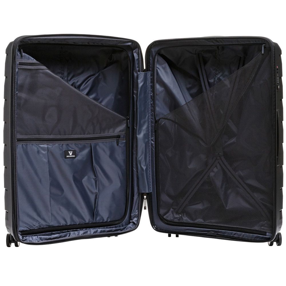 - Чемодан с 2 отделениями: одно из них с фиксирующими ремнями и сетчатой шторкой на молнии, второе — с разделителем на молнии