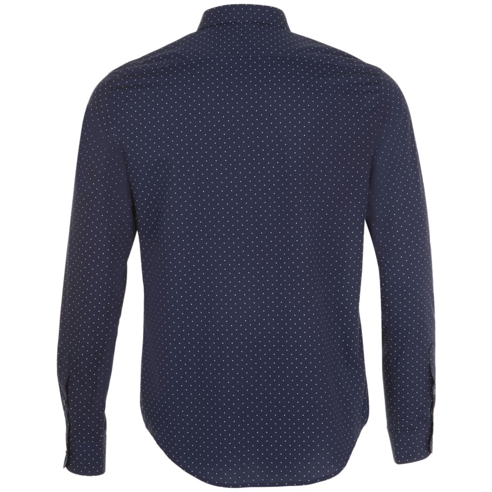 Модная рубашка с печатным рисунком в горошек, которая прекрасно впишется в современный корпоративный стиль.Облегающая модель с маленьким классическим воротничком, планкой с 7 пуговицами тон в тон и манжетами на 1 пуговице с разрезом «капуцин».