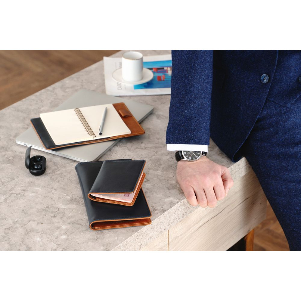 Чтобы передать этот удивительный контраст, для изделий Kalsa Palermo была выбрана гладкая натуральная кожа: глубокого синего цвета снаружи и светло-коричневого оттенка внутри. Оформленные в едином стиле, они легко собираются в подарочные наборы.