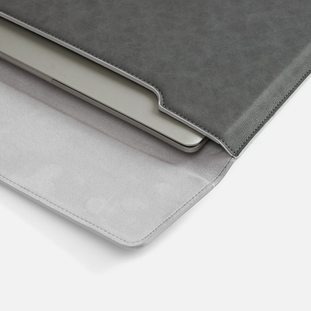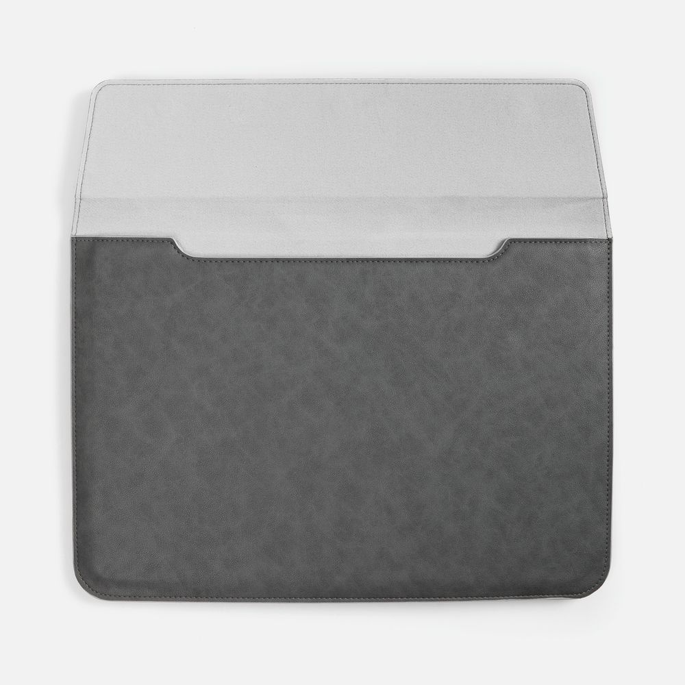 Чехол для ноутбука с диагональю до 15,6 выполнен из материала Petrus, серого цвета, дополнен окрашенным срезом края серого цвета.