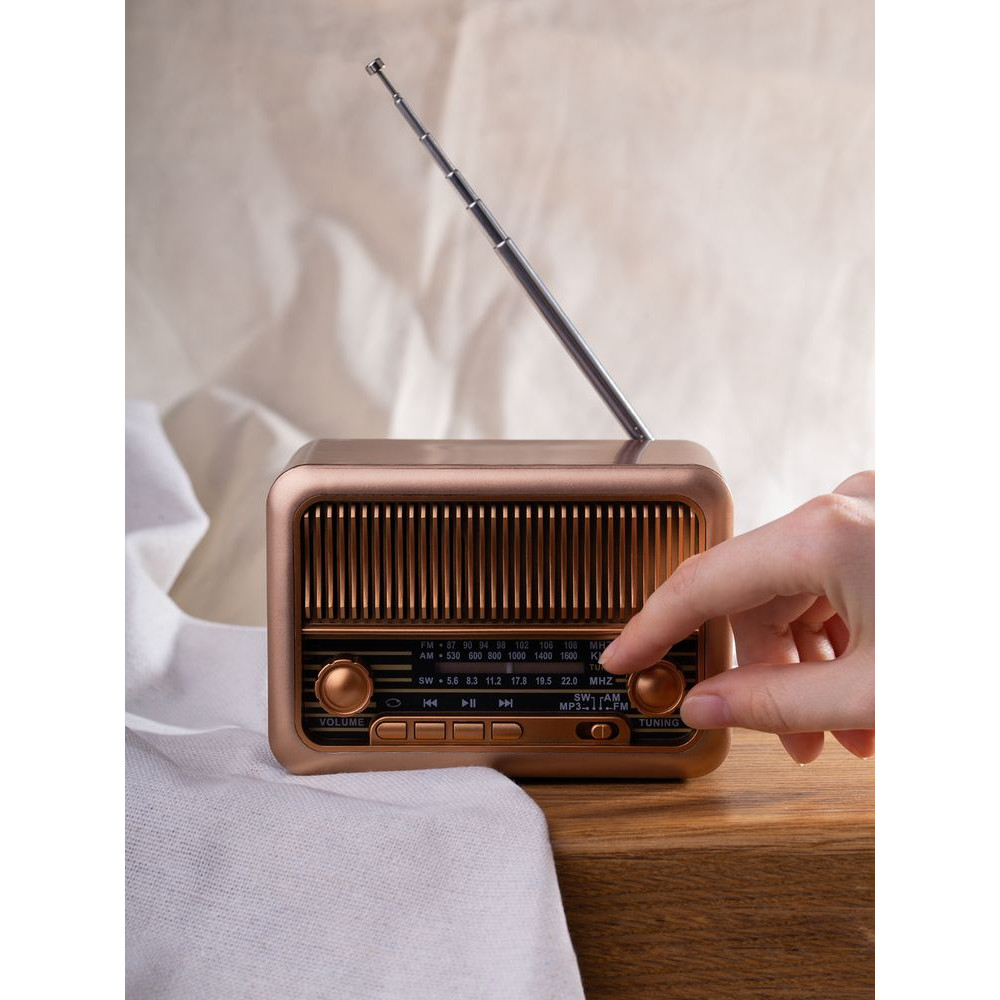 За корпусом, всем своим видом отсылающим к актуальному стилю мидсенчури, скрываются вполне современные функции: возможность воспроизведения музыки по Bluetooth и с карт памяти различного формата.