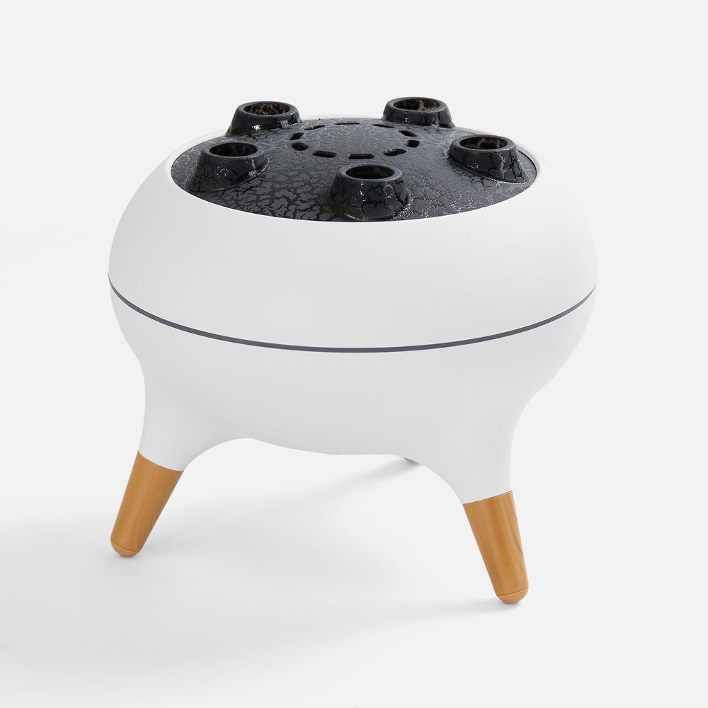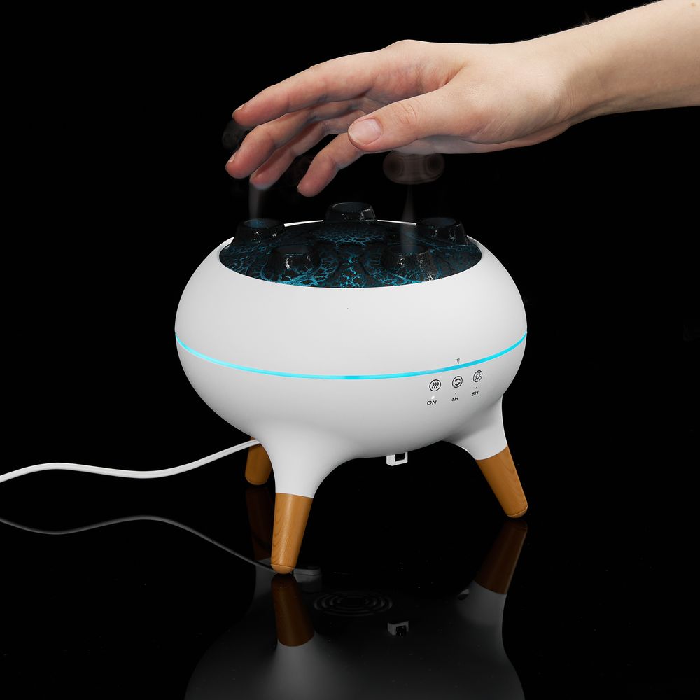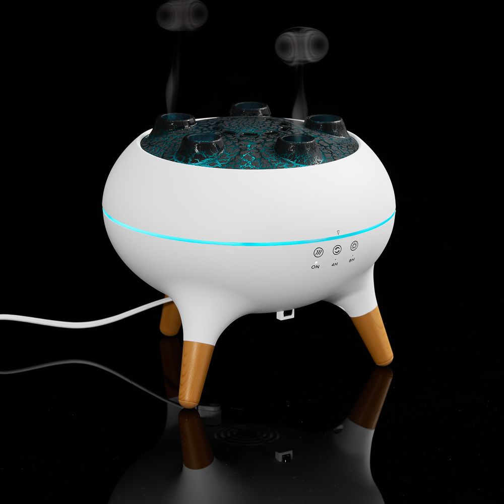 Помимо стандартных струек пара посередине крышки, Cloudini умеет выпускать маленькие облачка влажного воздуха из 5 отверстий по окружности поочередно или динамически — в такт музыке. Устройство реагирует на звуковые колебания и выстраивает интенсивность распыления в зависимости от мелодии.