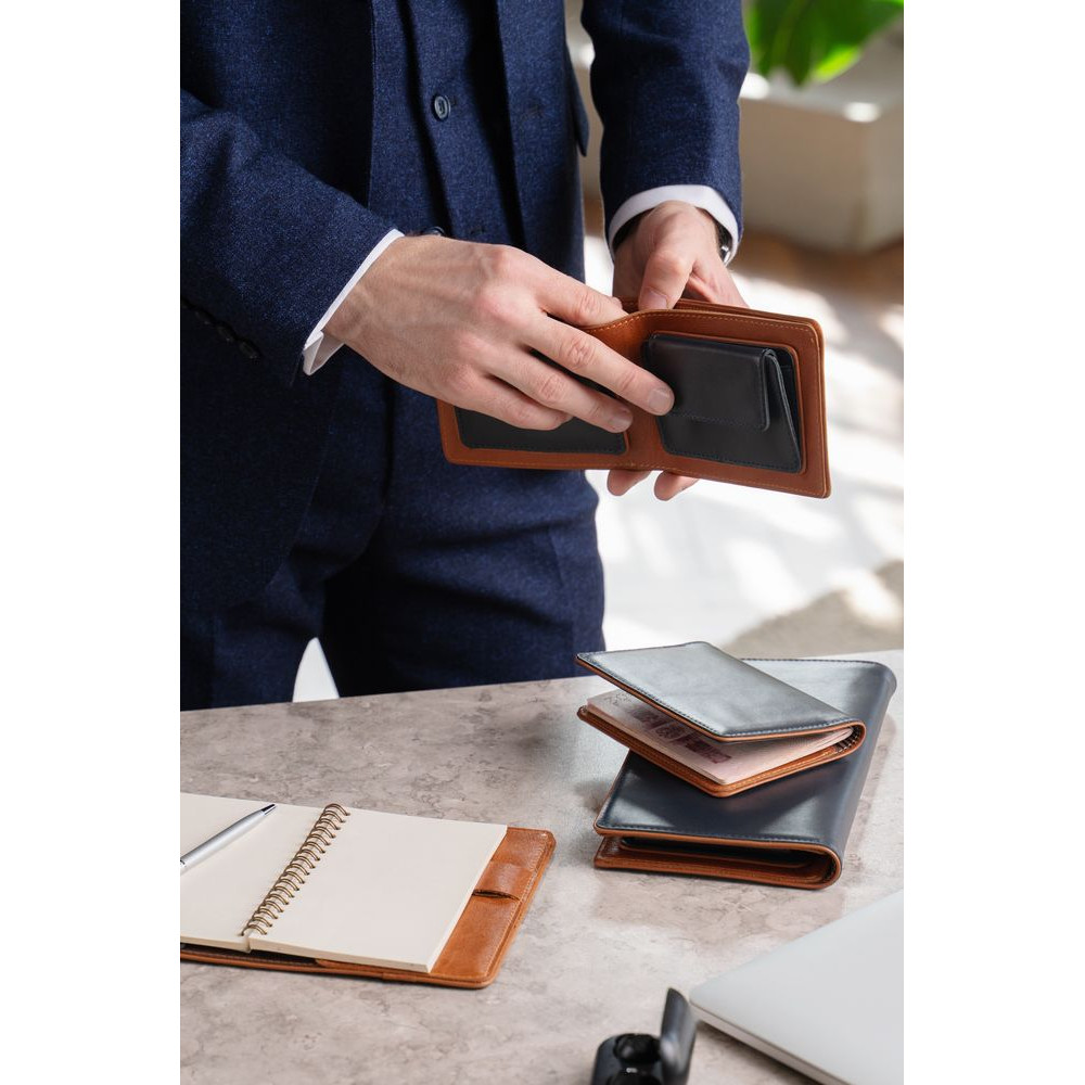 Чтобы передать этот удивительный контраст, для изделий Kalsa Palermo была выбрана гладкая натуральная кожа: глубокого синего цвета снаружи и светло-коричневого оттенка внутри. Оформленные в едином стиле, они легко собираются в подарочные наборы.