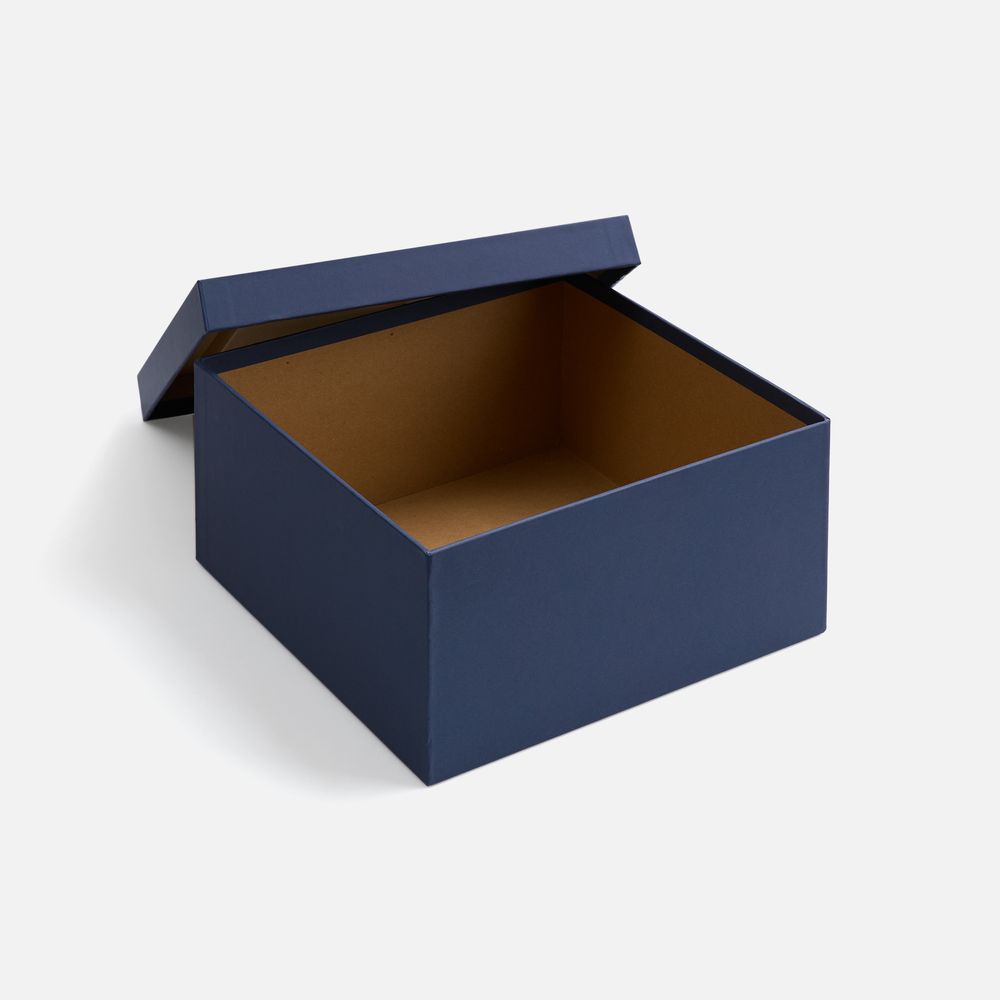 Коробка из переплетного картона, кашированного синей дизайнерской бумагой.