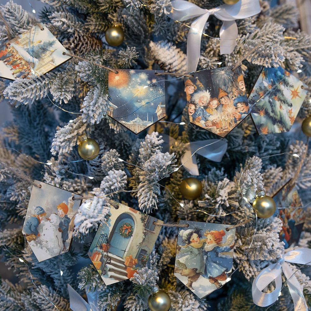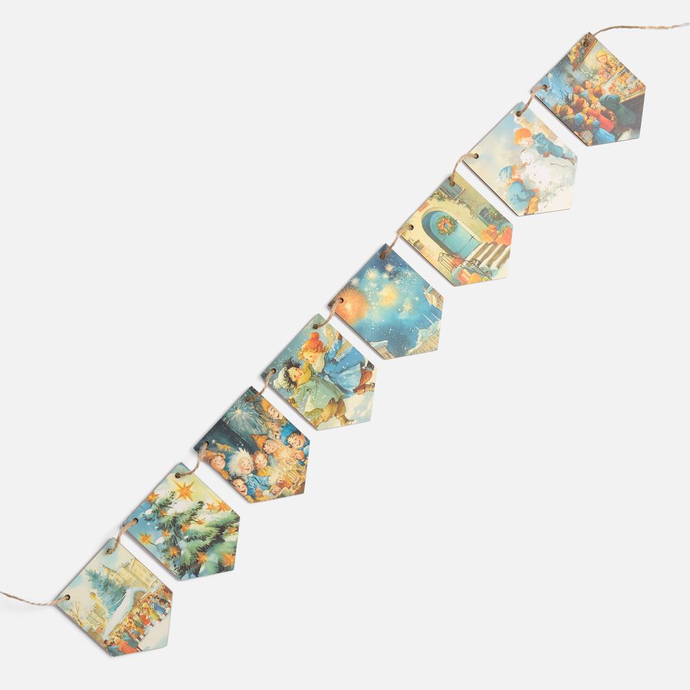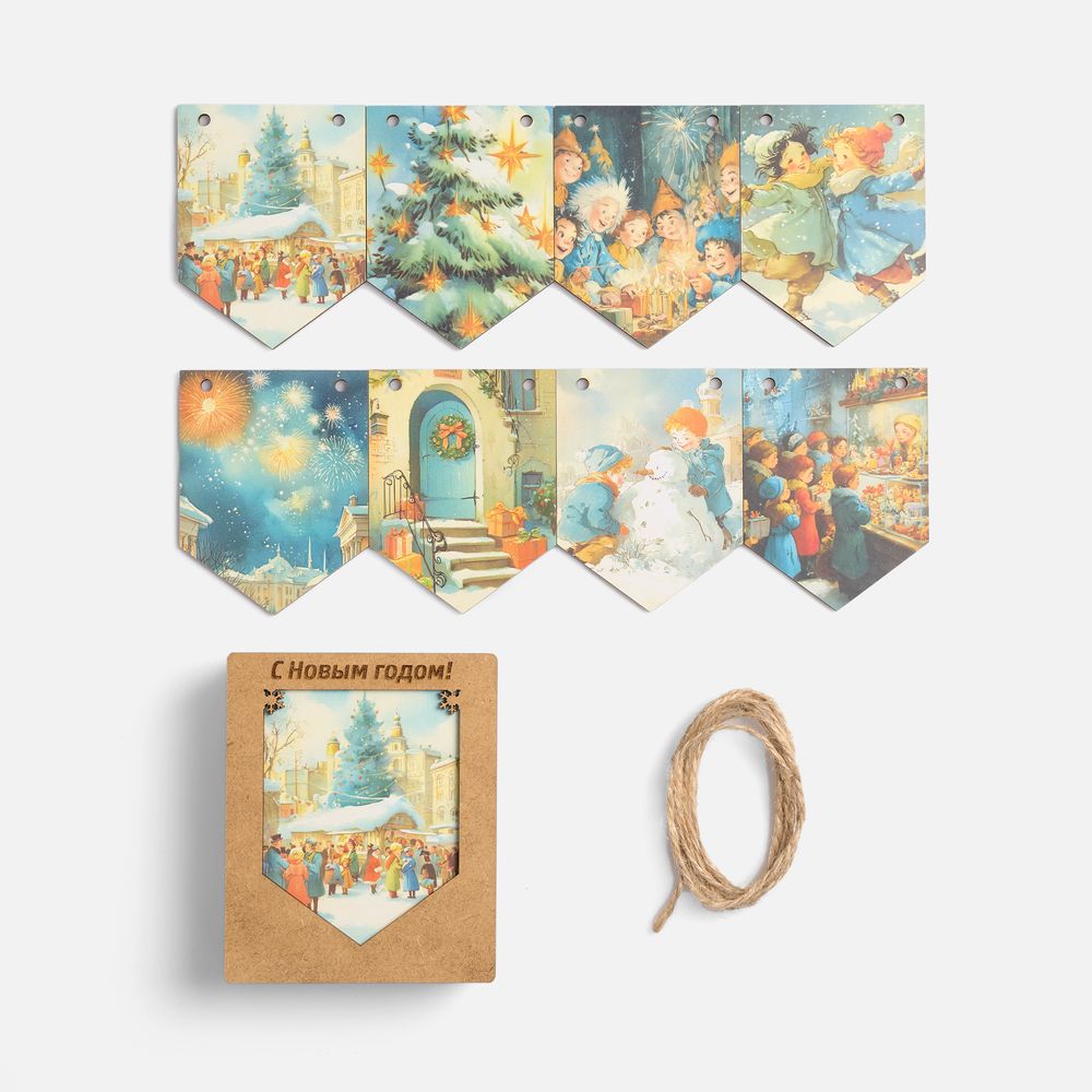 Очаровательная гирлянда из деревянных флажков с винтажными рождественскими иллюстрациями создаст уютную праздничную атмосферу дома или в офисе. Каждый флажок украшен теплыми душевными изображениями, будто сошедшими со старинных открыток. Они с легкостью перенесут в мир новогодних сказок и детских фантазий — туда, где и хочется оказаться в самое волшебное время года!