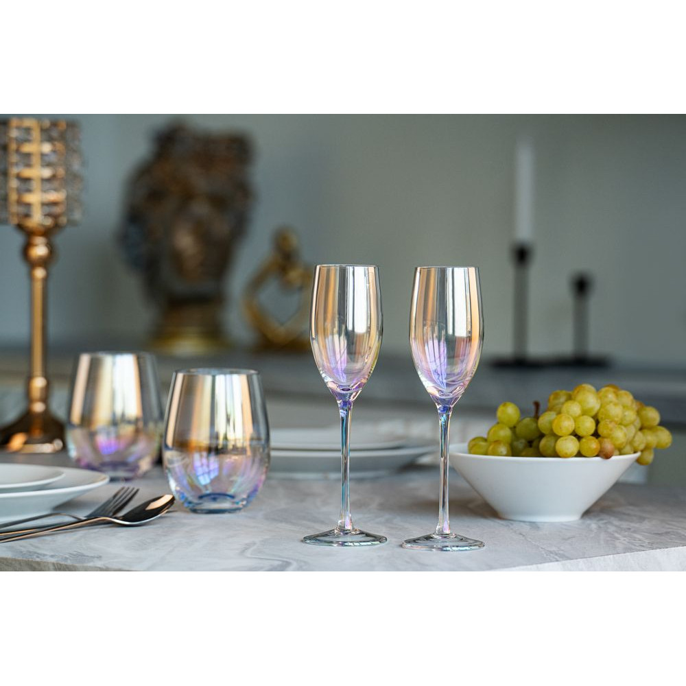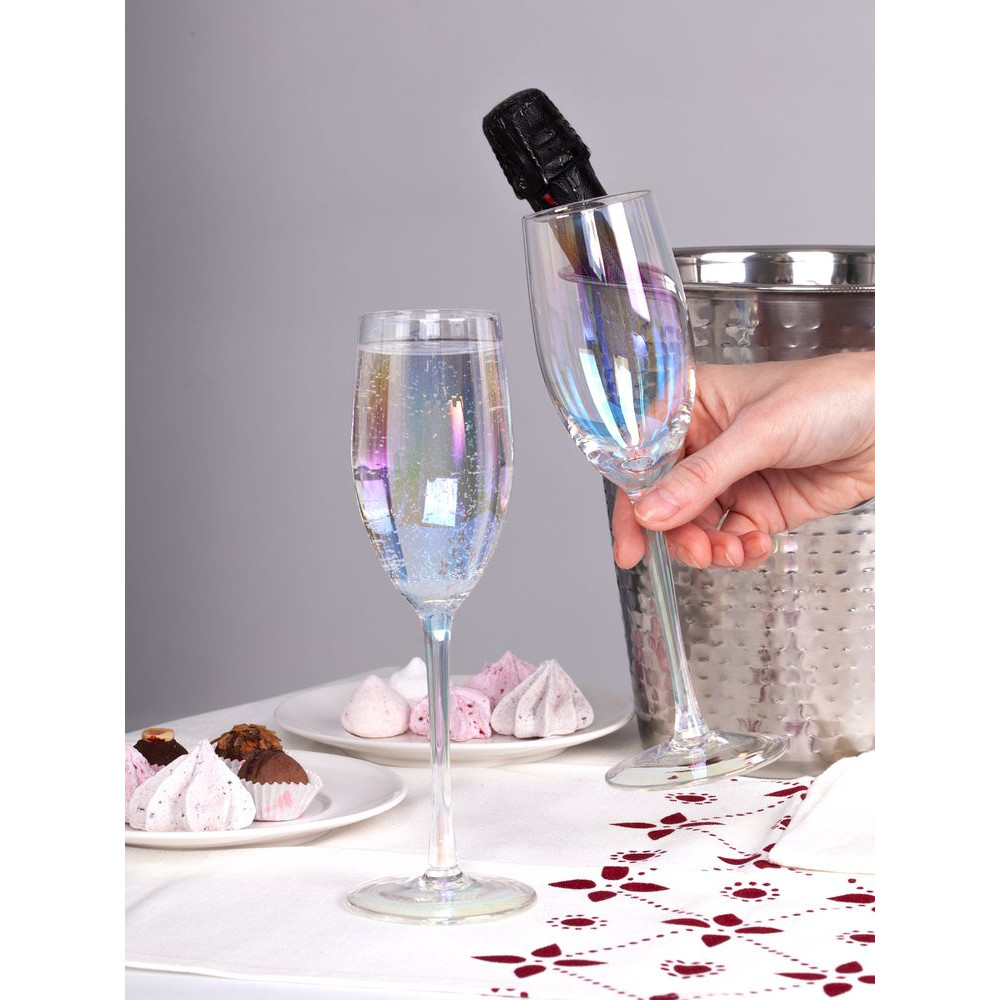 Бокалы для шампанского с перламутровым напылением Perola привлекают внимание своим изысканным дизайном. Переливающиеся разными цветами, бокалы зачаровывают и притягивают взгляды.