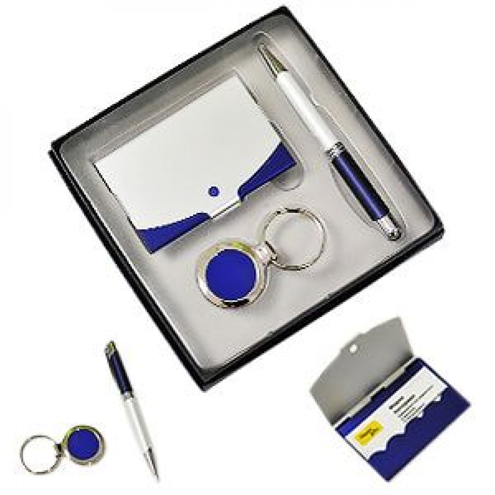 Параметры: Набор: авторучка, брелок и визитница; синий с белым; 16х16 см; металл; лазерная гравировка, тампопеч