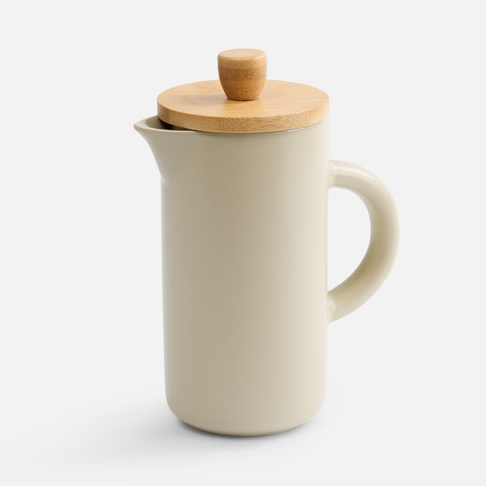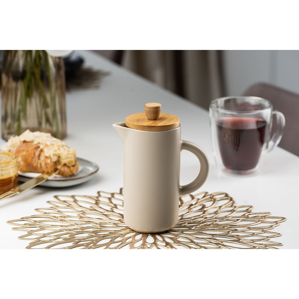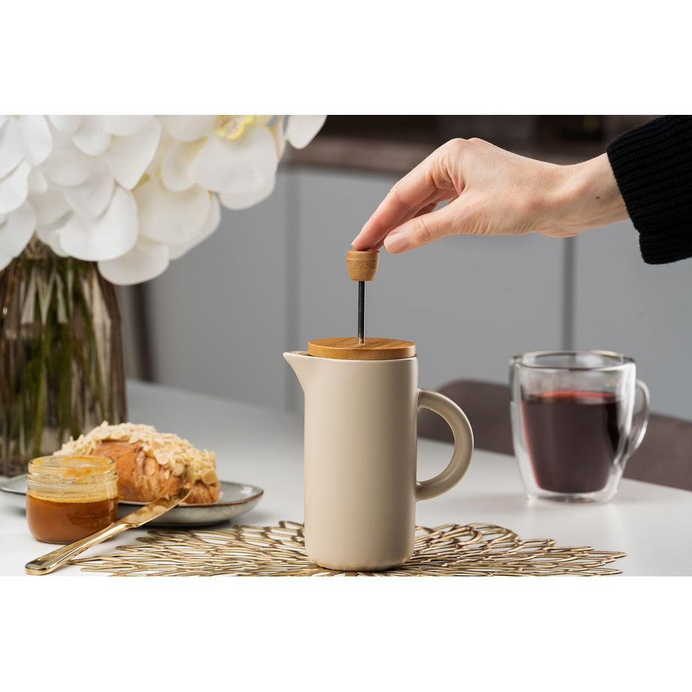 Френч-пресс Keramikk выполнен из керамики, благодаря чему он хорошо сохраняет температуру напитка, не обжигает руки и прост в уходе. Контраст бамбуковой крышки и керамики выглядит действительно интересно и необычно.Емкость 350 мл.