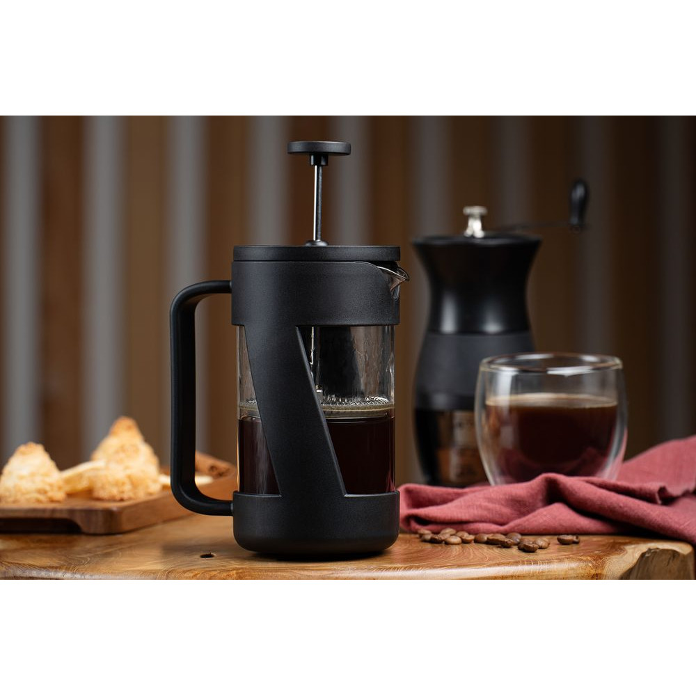 Френч-пресс подходит для заваривания как чая, так и кофе. Пластиковый каркас защищает колбу от повреждений и не дает обжечься. Колба из корпуса френч-пресса не вынимается.    Емкость 600 мл.