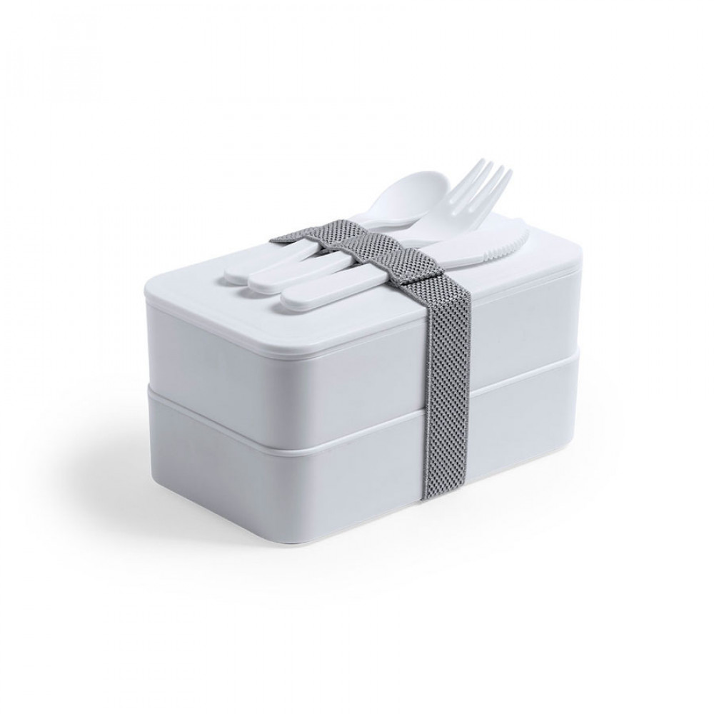 Ланч-бокс с двумя контейнерами, крышками и столовыми приборами: ложка, вилка, нож. Они крепятся на специальной резинке на корпусе изделия.