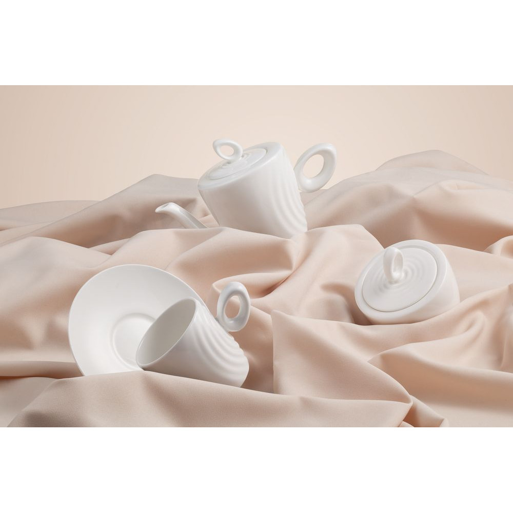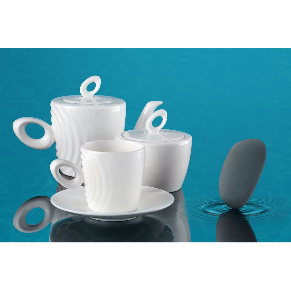 Крышка сахарницы создана в скульптурной технике: фарфор словно запечатлел сам момент движения. Необычная ручка предметов символизирует камень, от которого появляются завораживающие круги на воде.