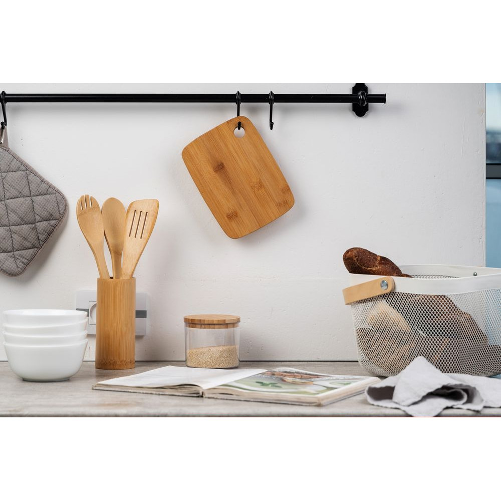 Бамбук обладает высокой прочностью и антимикробными свойствами. Доска не скользит по поверхности стола, легко моется после использования. Для удобства размещения на стене предусмотрено отверстие в верхнем углу.Поставляется в пакете.