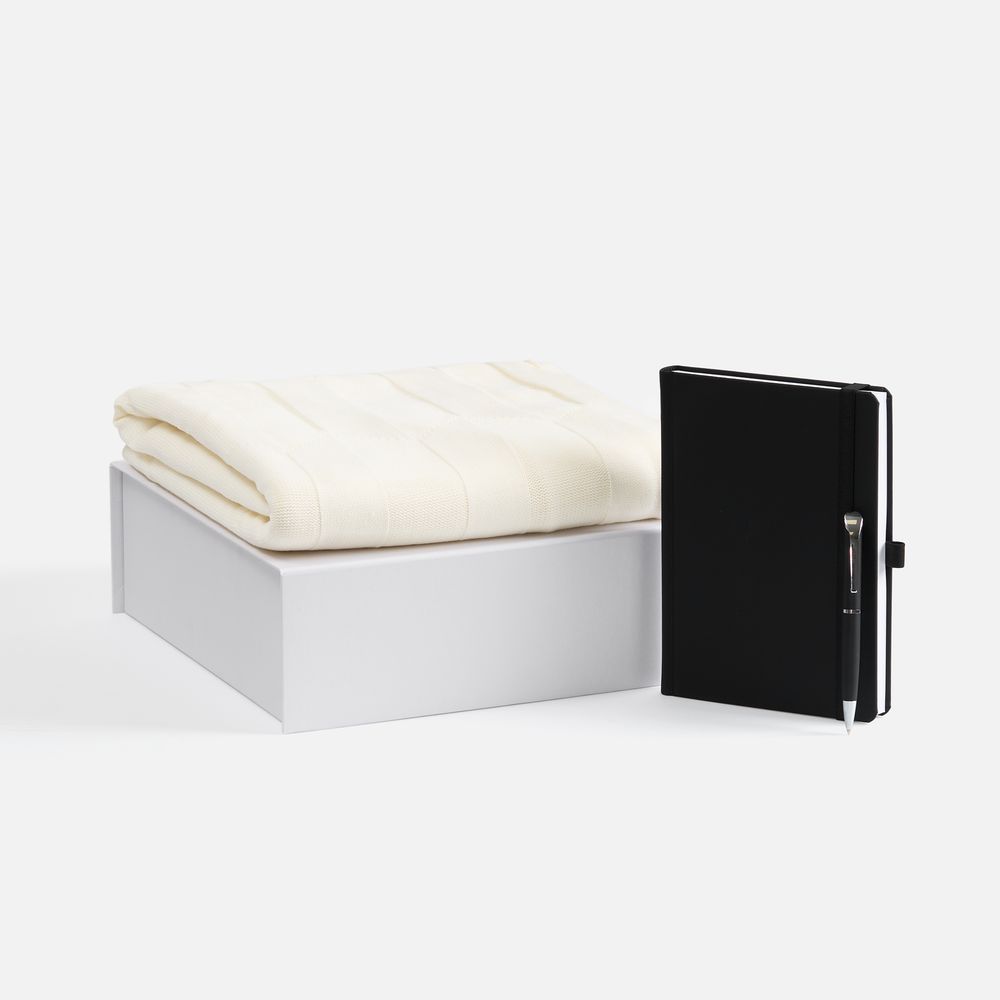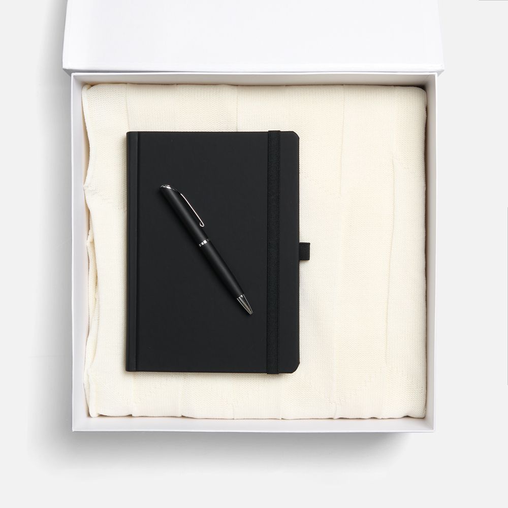 Однотонный набор с основной канцелярией и пледом — классика жанра в уютном исполнении. С компактным ежедневником будет удобно делать заметки в любое время — благодаря петельке для ручки любимый пишущий инструмент будет всегда под рукой. А изысканный акриловый плед с геометрическим узором позволит выразить самые теплые пожелания и ддобавит плавных линий в интерьер.