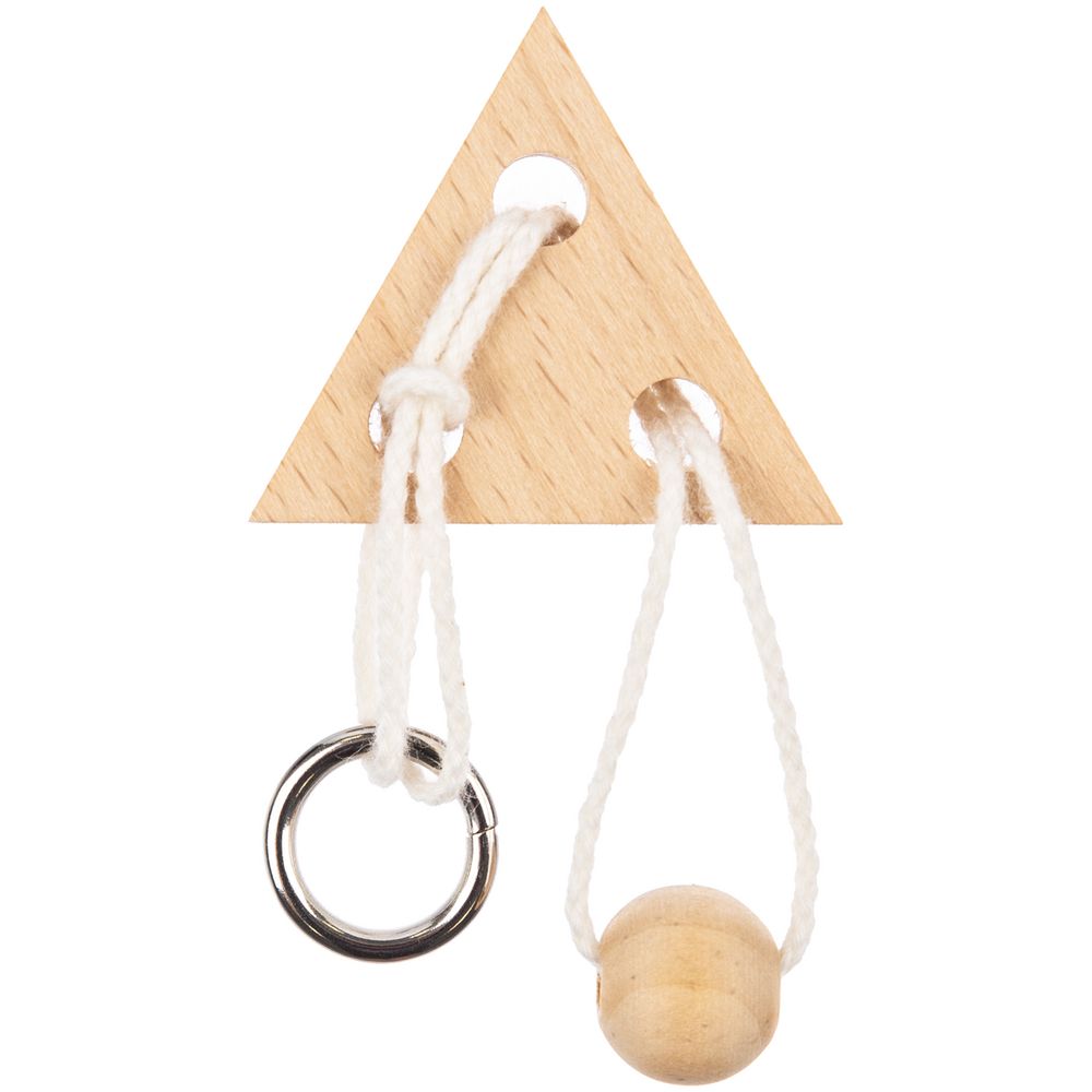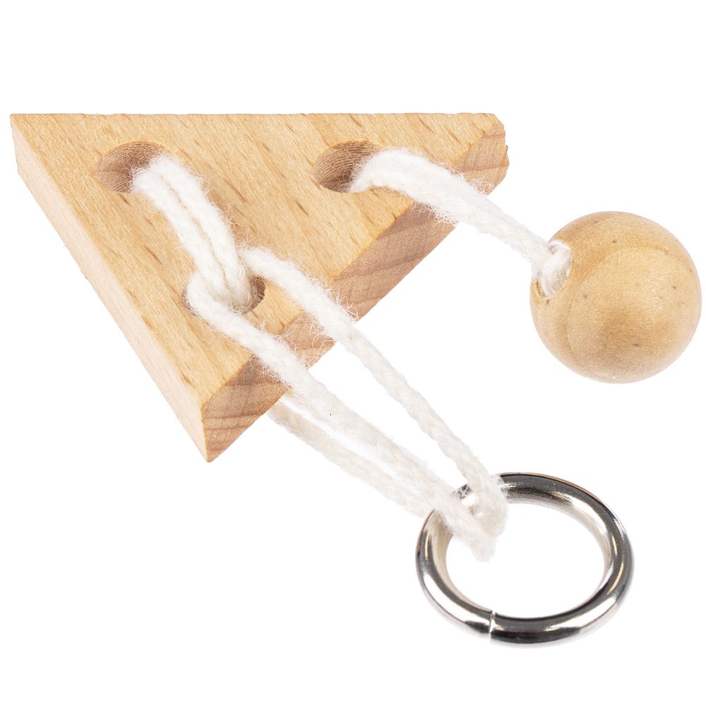 Миниатюрная головоломка Combi из натуральных материалов. Задача головоломки — разъединить ее элементы, не развязывая веревку.