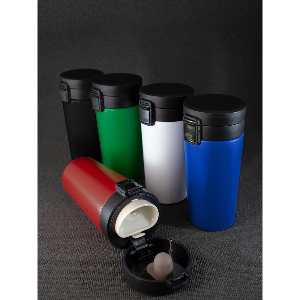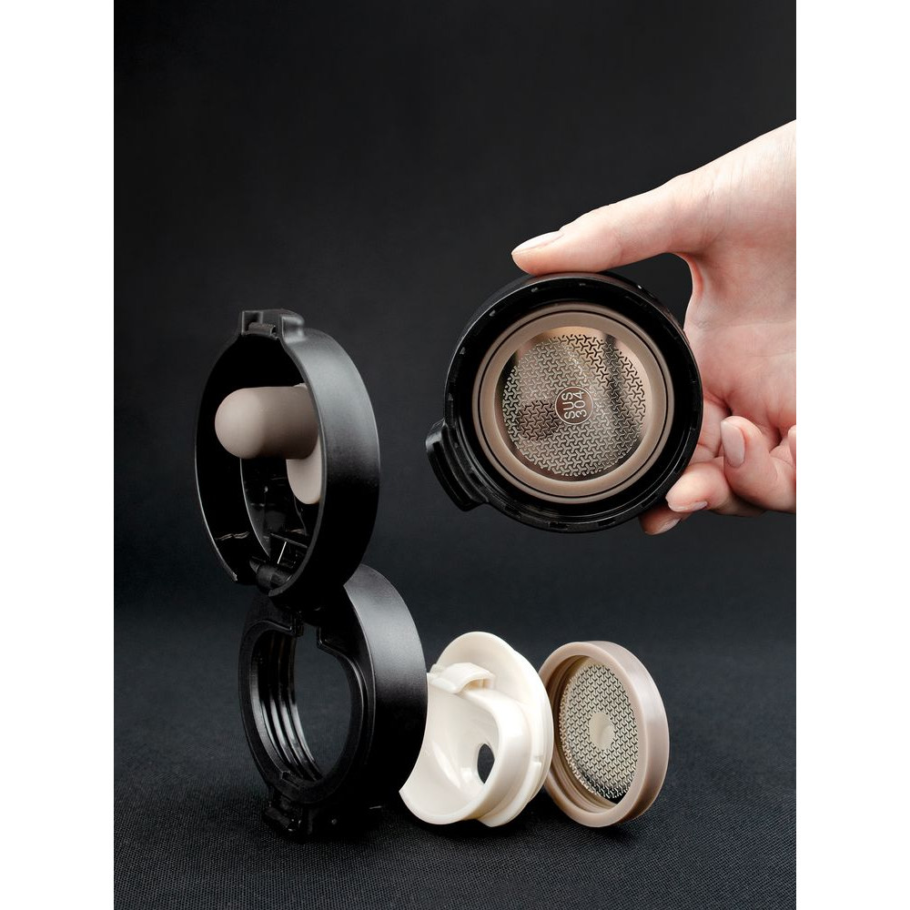 Двухслойная вакуумная конструкция из нержавеющей стали внутри и снаружи. Герметичная откидная крышка-клапан с ситечком.