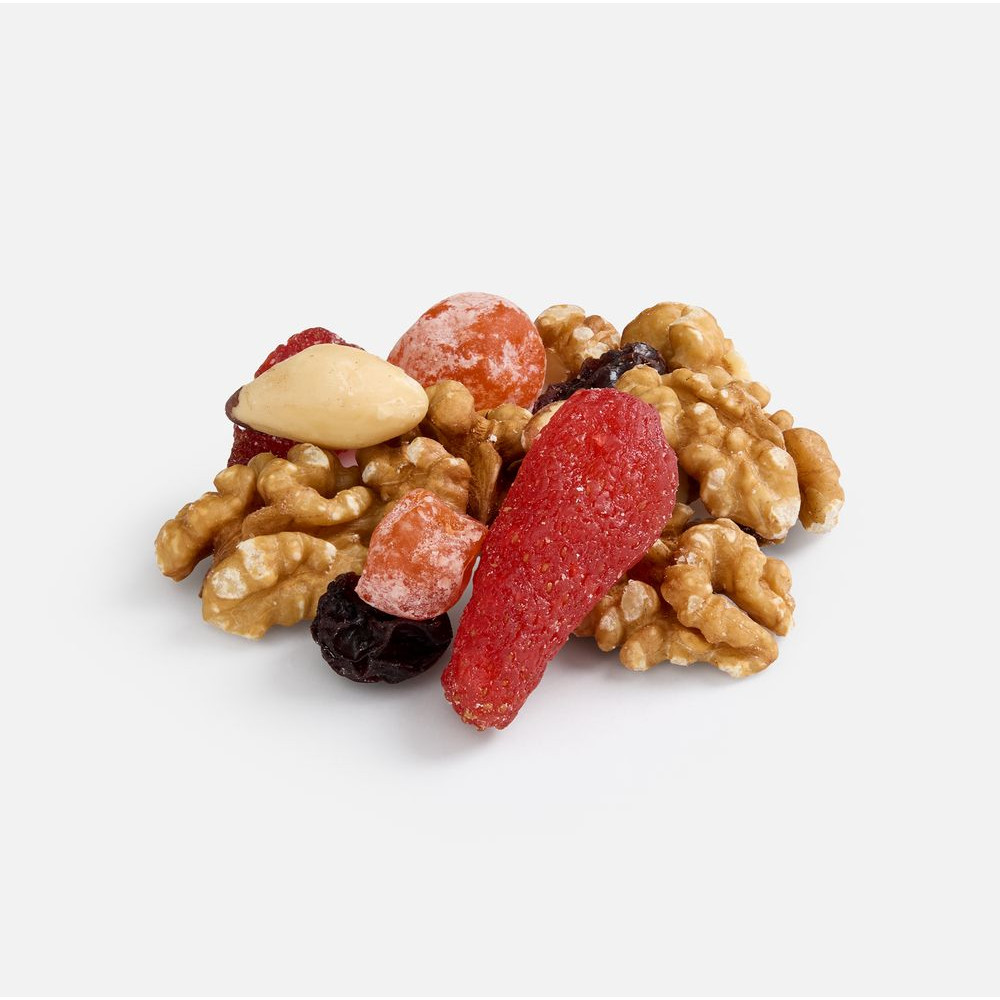 Состав: ядро бразильского ореха, кумкват сушеный, клубника сушеная, орех грецкий, изюм темный.