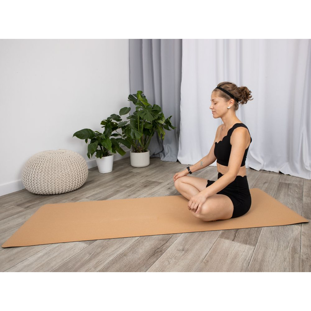 Лицевая сторона выполнена из пробки — экологичного, теплого и приятного на ощупь материала, а обратная из ТПЭ — термопластичного эластомера, который гарантирует надежное сцепление коврика с поверхностью.
