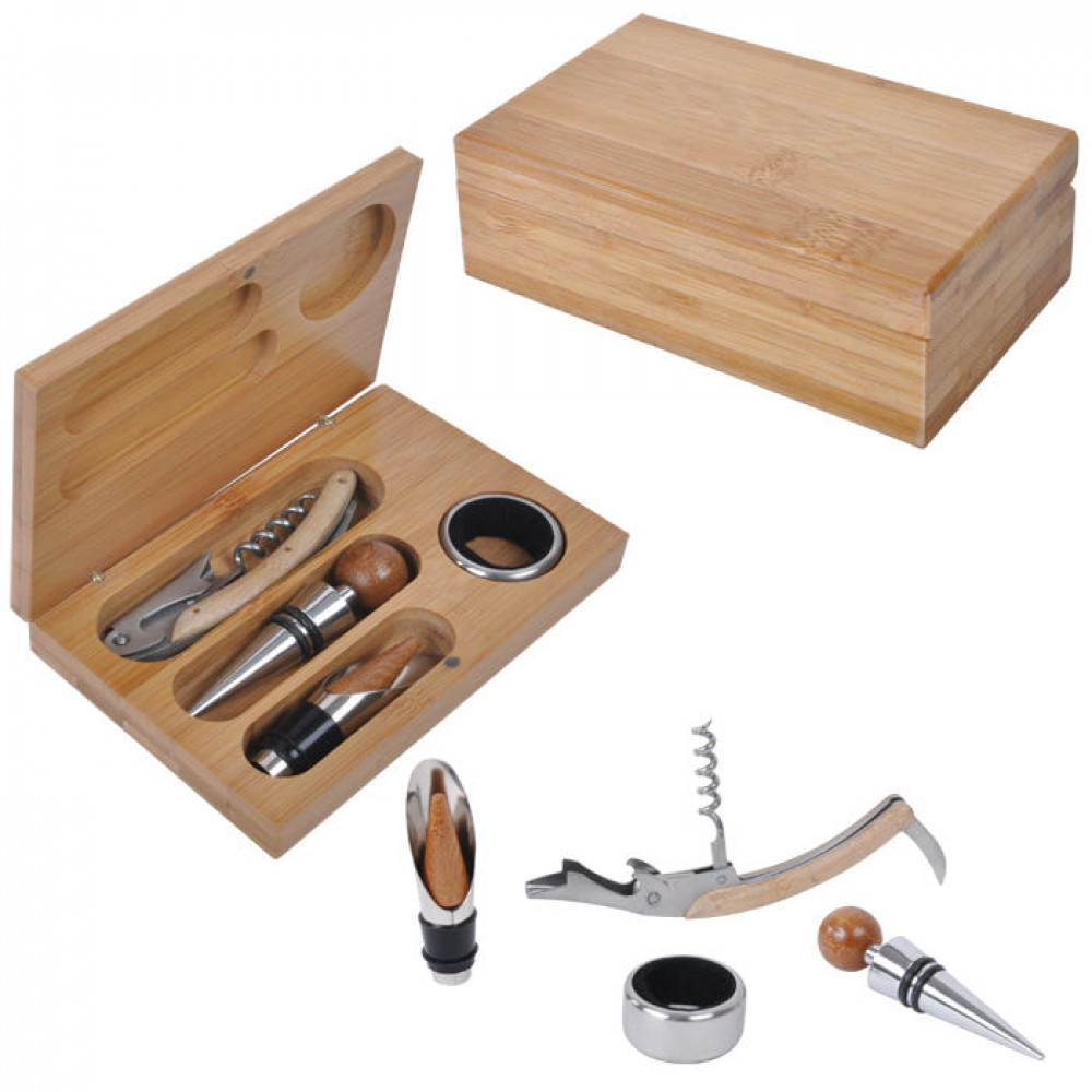Стильный набор для вина в коробочке из бамбука – одного из самых востребованных материалов для кухонных принадлежностей.